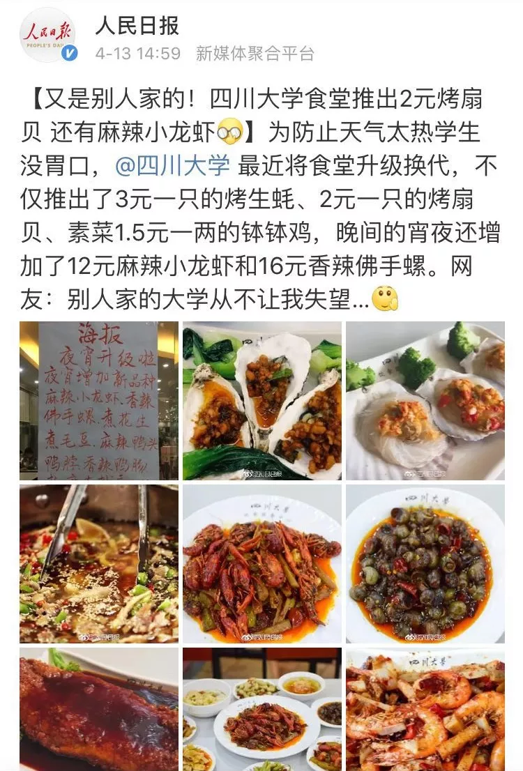 四川大学江安食堂,在去年开学季的时候,推出了生蚝、扇贝、钵钵鸡,这曾引发了排队热潮。这些创新菜品出现了,这表明高校食堂早就不再满足于解决温饱问题了,而是开始追求口味以及体验。厦大勤业餐厅、南光餐厅和芙蓉餐厅,还有学生公寓和西村这两个被称作“校外食堂”的地方,同样是凭借一道道招牌菜,给学子们留下了深刻的味觉记忆。